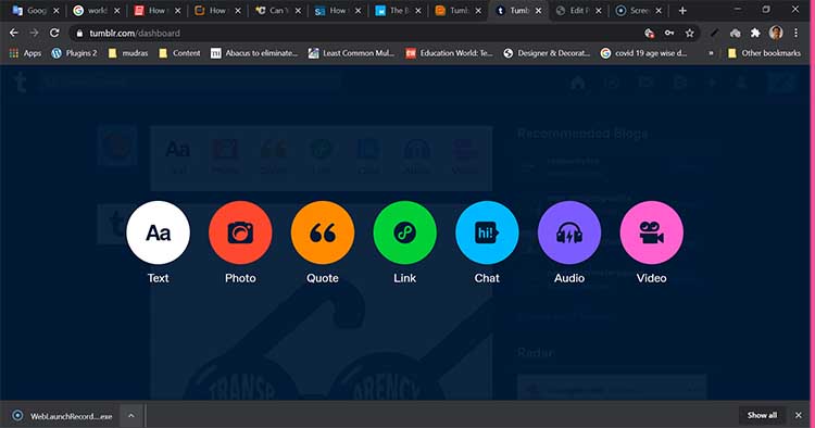 And when you feel you want to launch your own blog you can start. It is very much easy on Tumblr to create content. In the top-right corner of the Tumblr dashboard there is a blue color pen. Just click this pen icon and you will get multiple options to make a post.